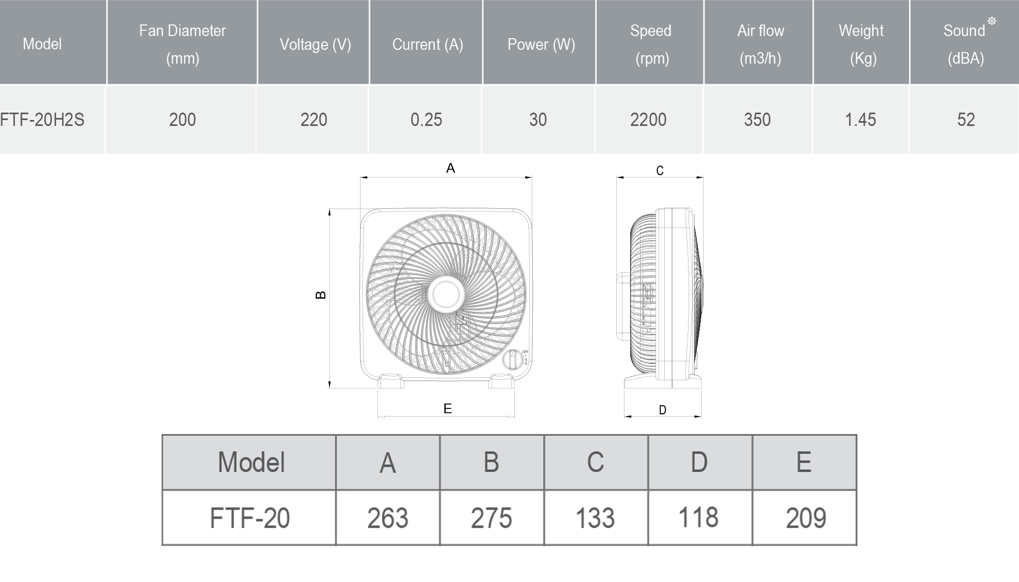 سایزی برابر 20 سانتیمتر دارد و پروانه ای که در این محصول به کار برده شده است به این گونه است که کارکرد محصول را بسیار آرام و بی صدا کرده است، به طوری که میزان صدایی که این پنکه از خود ساتع می کند 52 دسی بل است و زیاد روی شرایط محیطی تاثیر گذار نیست.