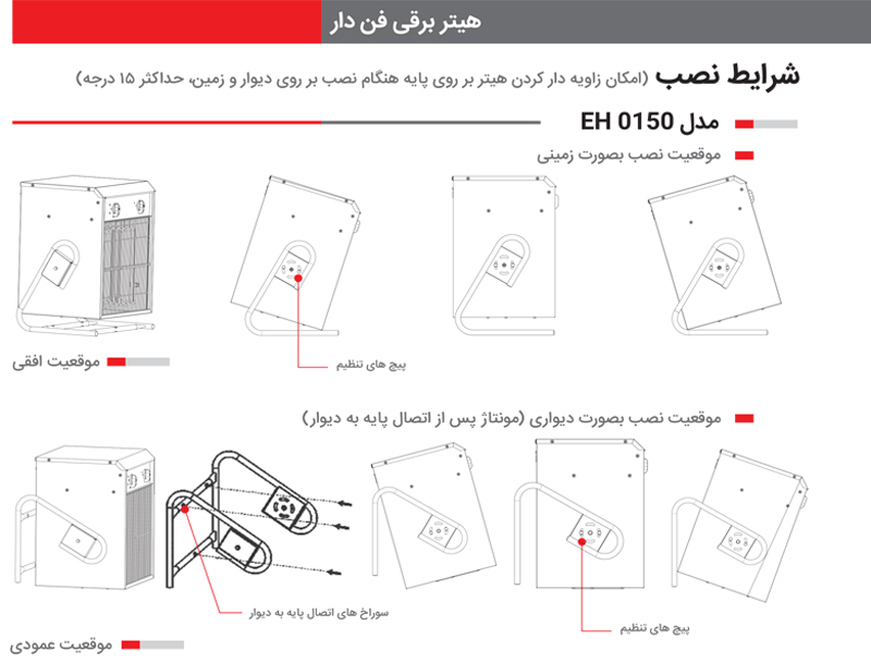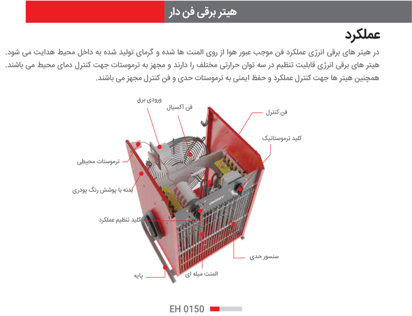 هیتر (بخاری) برقی فندار انرژی EH0150 سه فاز» در داخل محیط نصب میشود و برای فضاهایی با کاربری ویلا، پارکینگ، کارگاه، انبار، گرمایش موضعی، کیوسک، اتاق نگهبانی و بهعنوان خشککن در ساختمانهای درحال ساخت با ارتفاع سقف تا حداکثر 3 متر مناسب است. این دستگاه دارای استاندارد اتحادیه اروپا (CE) است و قابلیت تنظیم توان حرارتی در سه مرحله به میزان 5، 10 و 15 کیلووات را دارد. این هیتر دارای حجم و وزنی کم (20 کیلوگرم) بوده و قابلیت حمل دارد. کنترل خودکار دما از طریق ترموستات داخلی صورت میپذیرد. فن آکسیال دستگاه بسیار کمصداست. بدنه نیز توسط عایق اپوکسی در برابر زنگ زدگی محافظت میشود. کارکرد فن بهطور اتوماتیک پس از خاموش شدن هیتر تا خنکی کامل المنت ادامه پیدا میکند. قابل ذکر است که جهت راه اندازی این هیتر کنتور سهفاز با حداقل ظرفیت خالی 21.7 آمپر و کابل برق جداگانه 2.5×5 (پنج رشته با سطح مقطع 2.5 میلیمتر) مورد نیاز است که کابل مذکور بهطول 5 متر بهصورت رایگان همراه با محصول ارایه میگردد. ضمن اینکه این هیتر مجهز به پریز مخصوص برق دارای اتصال به زمین ( ارث) است که در هنگام نصب توسط نماینده خدمات پس از فروش شرکت انرژی متصل میشود. در مکانهایی که ارث ندارند، استفاده از کلید حفاظت از جان الزامی است. این هیتر امکان نصب روی زمین و یا روی دیوار ( حداکثر تا ارتفاع 2 متر) را داراست. نکته مهم اینکه این محصول را نباید در محیطهای حاوی مواد اسیدی و خورنده نصب نمود.